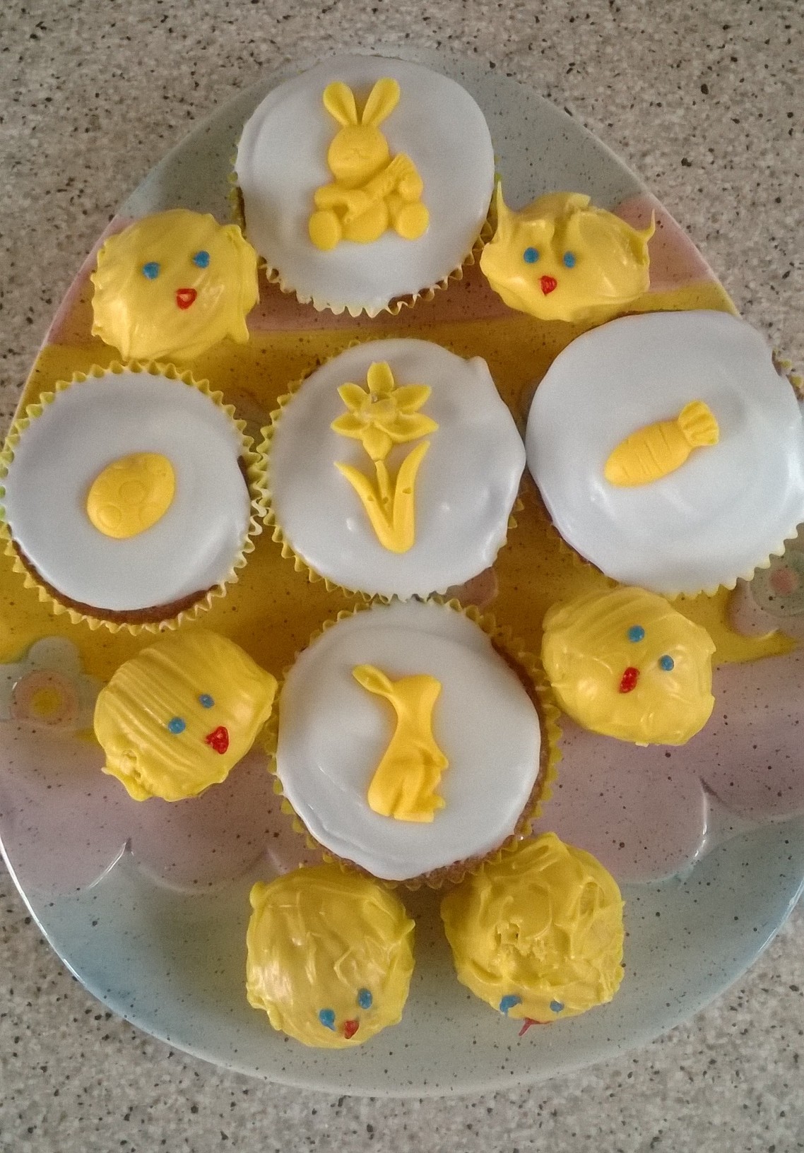 The above are the Kitchen decorations, our driftwood tree provides the centrepiece for the window with gorgeous bright daffodils and mementos from previous Easters, the yellow crochet chicks are handmade by Grandma and whilst on Easter Sunday will be sitting on a chocolate egg, for display purposes and to avoid temptation they currently sit on empty plastic eggs! Its not a great picture so its hard to see Little Miss’ Easter basket made at Rainbows and by the tree is a stone washed up on the beach on which I have painted a cross. To me Easter is an important religious celebration and this should be reflected in our decorations,