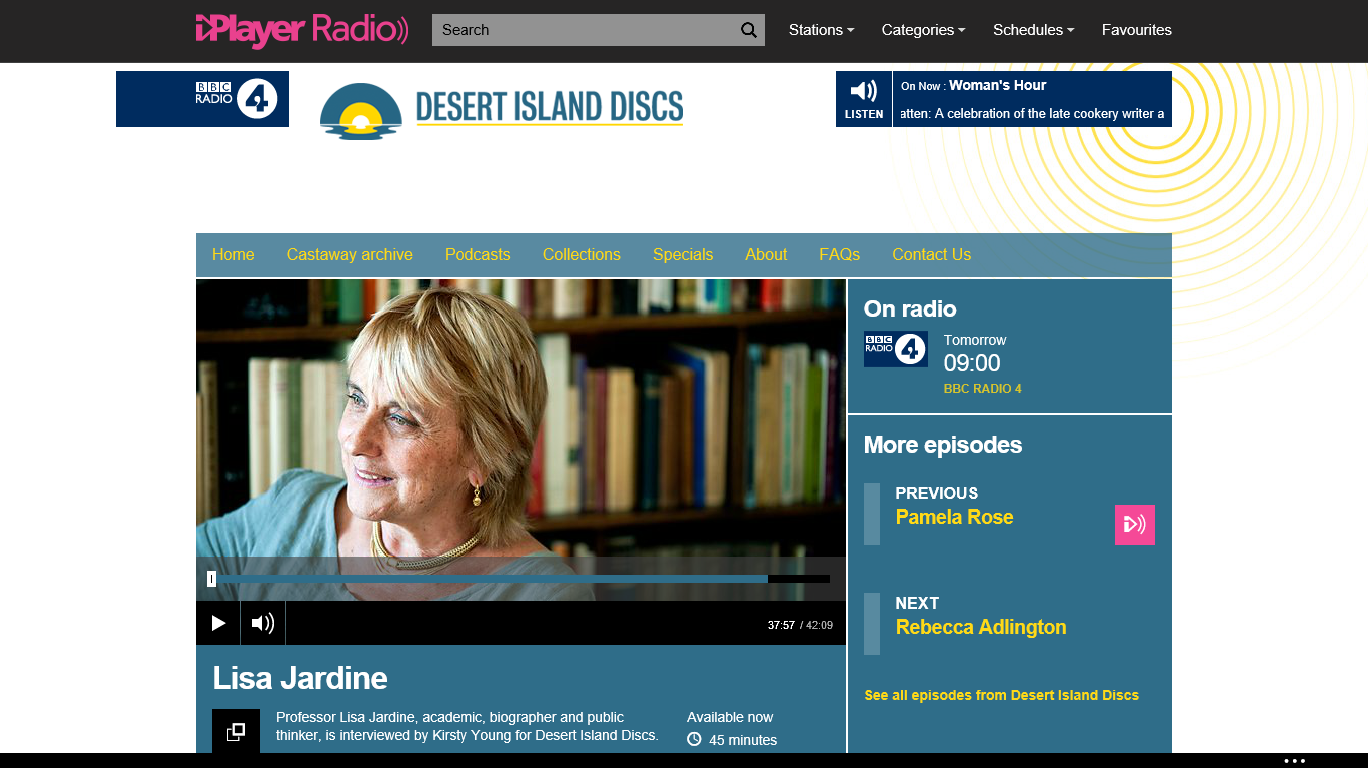 Alerted by Twitter, I listened to an excellent Desert Island Discs on Sunday with the indomitable (you’ll need to listen to the programme) Professor Lisa Jardine. She was bright, intelligent and witty and made some brilliant comments. I was truly inspired and impressed by her.