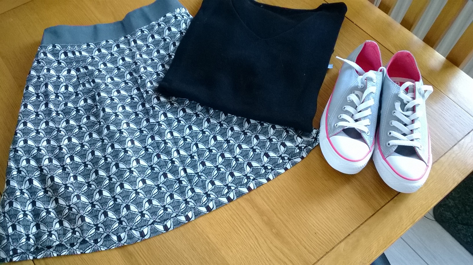 Whilst its not so much wearing I did try on lots of clothes on my shopping trip, the beauty of a child free trip gave me the time to experiment and put together different pieces. I’m trying to develop my look, it needs to be casual and fit in with my life style. I wear jeans for work but at other times am not really a trousers girl, my legs are a bit short so I tend to stick with skirts, tunics and dresses with leggings or thick tights. I ended up with a new White Stuff skirt and v neck black jumper to be paired with the obligatory leggings. I also bought a cute pair of Converse pumps, I love my winter boots but it’s nice to have something a little lighter too. I find it difficult to find a comfortable and flattering flat leather shoe so I’m hoping the pumps will be a winner.