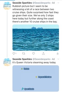 I don’t know what the term is for a ship spotter but it’s my new little lockdown obsession. There are loads of cruise ships on the south coast at present and they often sail up and down. I’ve discovered a website which maps where the ships are and it’s been a great reference site.